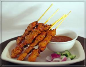 Små grillspyd med marinerede kyllingestykker serveret med jordnøddesauce