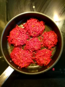 - Pres saften fra rødbederne og bland dem med resten af ingredienserne i en skål.Hvis ‘farsen’kan formes til bøffer nu så gør det, hvis den er for våd tilsættes lidt mere havregryn indtil den hænger godt sammen.Steg bøfferne på panden ved middel varme. Vend dem først, når de er stegt færdig på den første side. Pas på når de vendes, da de nemmere falder fra hinanden end almindelige bøffer.